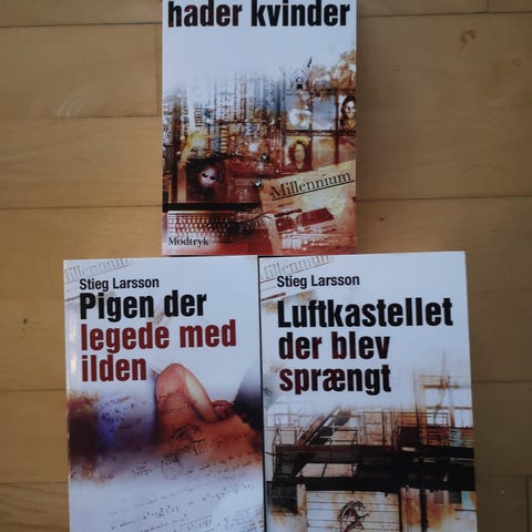 Stieg Larsson Millennium bogsæt på dansk. Sættet indeholder tre bind: "Mænd der hader kvinder", "Pigen der legede med ilden" og "Luftkastellet der blev sprængt".