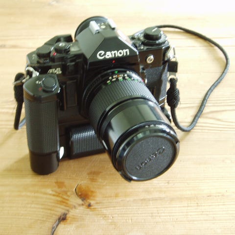Canon A-1, et klassisk analogt spejlreflekskamera (SLR), der bruger 35mm film. Det blev lanceret i slutningen af 1970'erne og er kendt for at være et af de første kameraer med en fuldautomatisk program-eksponeringsmode.