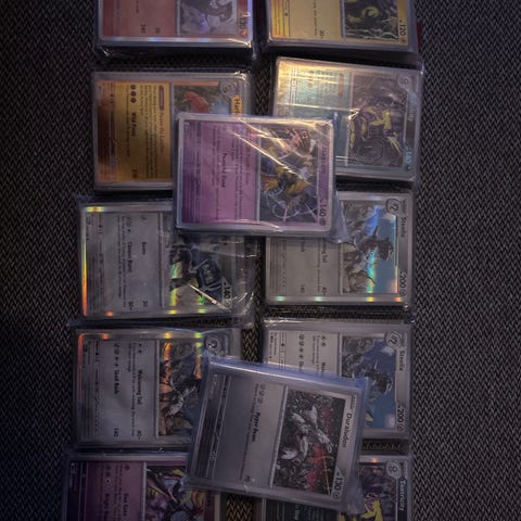 Der medfølger både almindelige kort, holo/reverse holo kort samt specialkort i plastiklomme.