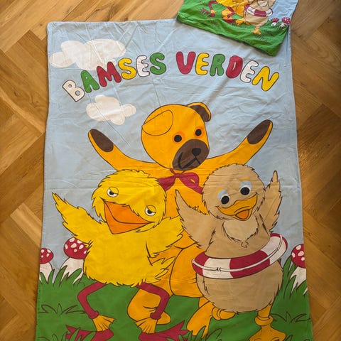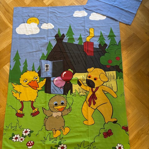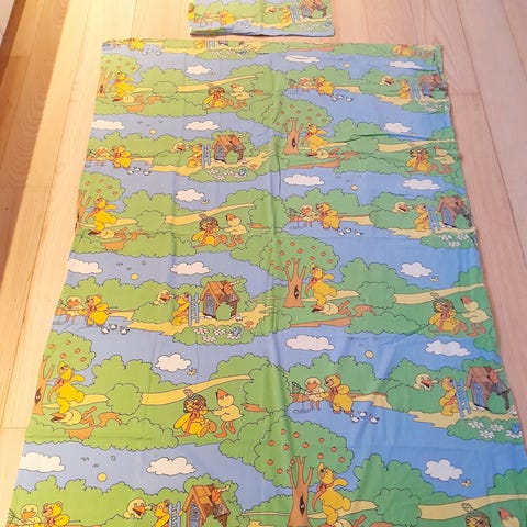 Juniorsengetøj med bamse & kylling. Der er to plamager på (se billeder). De er dog svære at se. Ellers i rigtig fin stand