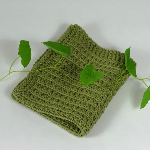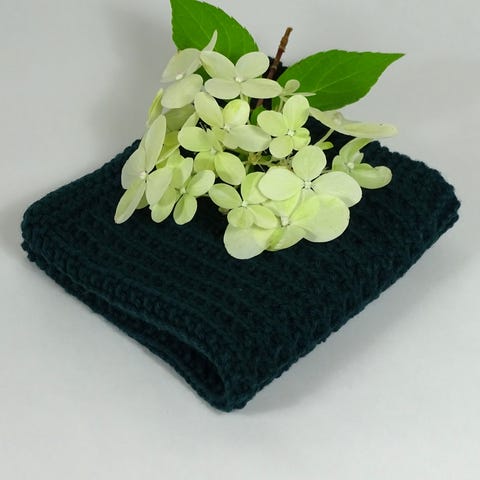 Håndlavet strikket klud af 100% bomuld i en dyb armygrøn. Et miljøvenligt valg til både rengøring og badet - genanvendelig og ingen mikroplastik.