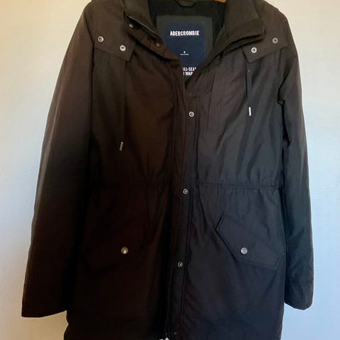 Abercrombie & Fitch vinterjakke til kvinder i størrelse M. Jakken er sort og fremstillet i polyester. Den har hætte med pelskant, gennemgående lynlås foran samt trykknapper. Foret indvendigt for ekstra varme. Ærmet har Abercrombie & Fitch logo-mærke. Velegnet som varm overtøjsjakke i de kolde måneder.