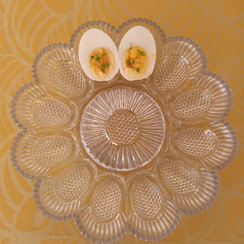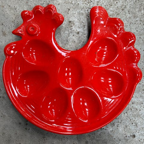 Påskebordets pryd må være dette fine fad med plads til 10 æg - og hhv. salt og peber i de to tilhørende høns.