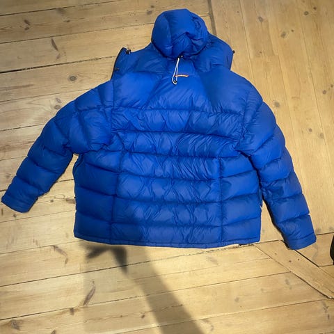 Peak Performance vinterjakke til herre i størrelse L. Jakken er fyldt med dun og har gennemgående lynlås foran. Farven er blå, og designet er quiltet med vandrette syninger. Jakken har hætte og Peak Performance-logo på brystet. Velegnet som varm overtøjsjakke i koldt vejr.