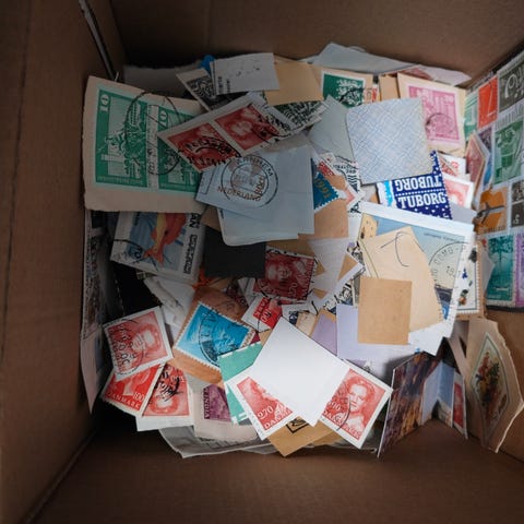 en kasse med afklip frimærker fra det meste af verden