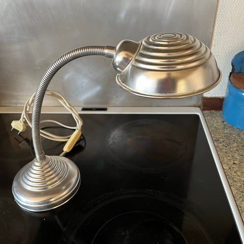 Bordlampe med flexarm, i gråmalet metal og teaktræ.