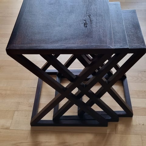 2 hjørneborde lavet af mango træ, som er i fin stand. Stk 350kr