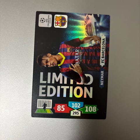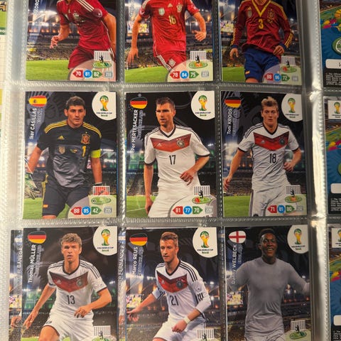Panini Adrenalyn XL samlekort fra FIFA World Cup Brasil 2014. Kortene viser fodboldspillere i landsholdstrøjer på forsiden og turneringens grafik på bagsiden. Egnet til samling eller bytning af fodboldkort.