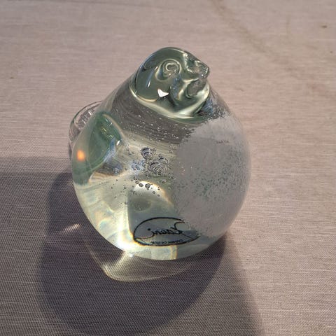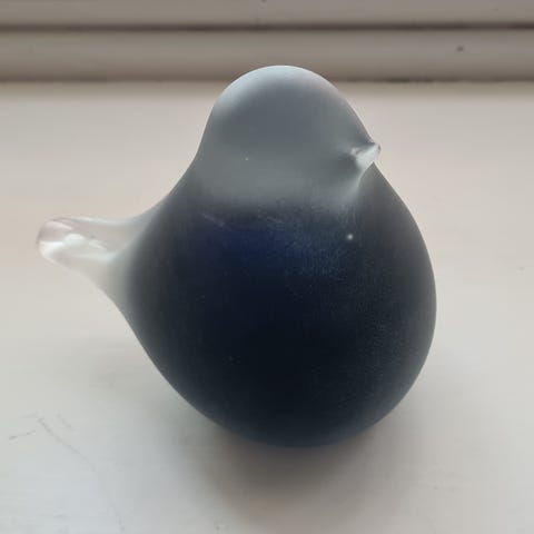 Produktet er en glasfigur formet som en fugl med en rund krop og detaljeret hoved. Den er gennemsigtig med små bobler indeni, hvilket giver en særlig æstetik. Glasmaterialet tilføjer en elegant glans.,Afhentes i:,Røde Kors Horsens (615),Bemærk at mail, chat og beskeder ikke besvares, og varen skal købes på knappen "Gå til varen"