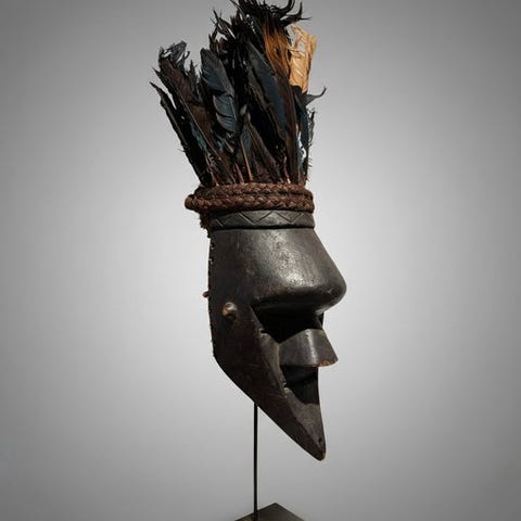 Bakongo træmaske fra Congo, skønnet fra 1930–1940, 30 cm høj og 22 cm bred, i god stand med aldersrelaterede slidmærker, sælges med skræddersyet stand og certifikat om ægthed fra en belgisk privat samling. Klik på den blå "gå til varen" knap, for at købe eller byde på denne vare. Den samlede pris vil blive vist inden du afgiver dit bud.