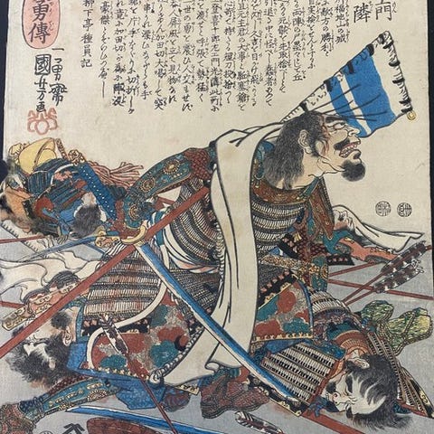 Fremragende. Dette tryk viser den varme, jordnære farvepalette, der er karakteristisk for produktionen i sen Edo-periode — de rige orange-røde og dybe brunlige nuancer af den detaljerede lamellære rustning (ō-yoroi) har ældet til en smuk patina, som samlere værdsætter. De indviklede tekstilmønstre på samuraierne — med geometriske og blomsteragtige motiver i