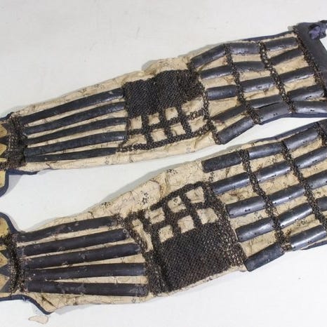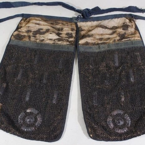Edo-periodens smedjernsharnisdel, 5 Dan Ita Sode af Samurai Yoroi, sortlakeret, ca. 25 cm høj, 24 cm bred, 1,1 kg, Japan, mere end 200 år gammel, i rimelig stand. Klik på den blå "gå til varen" knap, for at købe eller byde på denne vare. Den samlede pris vil blive vist inden du afgiver dit bud.
