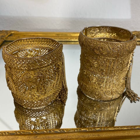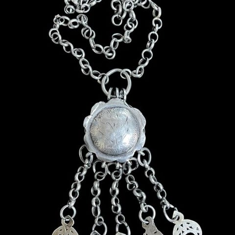 Fra Nepal består denne lot af et par sølvøreringe med koraller og turkis og en afghansk sølvring udskåret som et segl, begge fra anden halvdel af det 20. århundrede; øreringene måler 9 × 3,5 cm, ringen har US-størrelse 7½ (indre diameter 17,75 mm) og vejer 15 g. Klik på den blå "gå til varen" knap, for at købe eller byde på denne vare. Den samlede pris vil blive vist inden du afgiver dit bud.