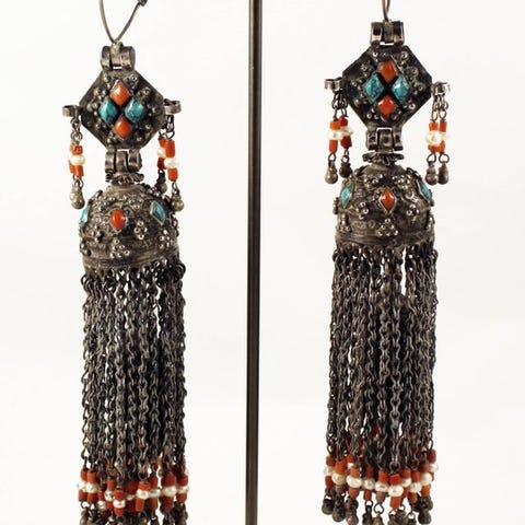 Et par øreringe fra Nepal, lavet af sølv, koraller og turkis.