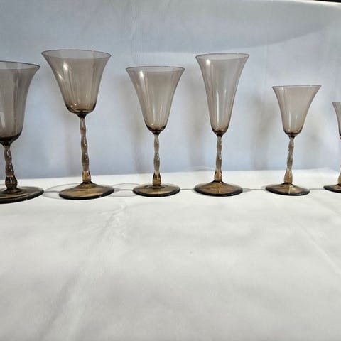 Udstillet i mundblæst farvet glas i tranebærrød eller "cranberry glass" med gulddekorationer af 6 vinglas, højde 16,4 x diameter 6,9 cm + 1 flaske med kork, højde 29,8 x diameter 9 cm. Det tranebærfarvede glas (cranberry glass) opnås ved at tilsætte guld til det smeltede glas. Stilen antyder en oprindelse i Bøhmen omkring begyndelsen af det 20. århundrede. Den har et matchende låg og rige guldemaljede dekorationer, typisk for perioden. Dekorationerne viser indviklede firkantede rammer og blomsterdetaljer på den facetterede fod og på karafens krop, med en rund base. Den har et tungt låg og den originale decalcomanie "Bohemia Jeweled Glass". Intens farve og guld påført manuelt med detaljer. Usigneret. Cabochonerne er indlagt i rubin på gennemsigtigt krystal og derefter skåret for at afsløre det gennemsigtige krystal, som derefter forgyldes