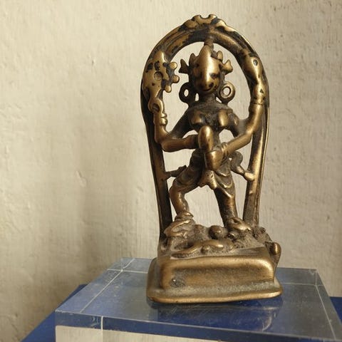 En kobberfarvet bronse, hvor Hanumán ses, mens han udfører mudraen namasté, hilsenen, rettet mod Rama. Den fremhæves af den smukke buede udsmykning af halen, der danner en slags halo omkring hans hoved. Den meget smukke patina på bronzen vidner om det utal af pujaer, der er foretaget med den, og den bevarer rester af sandeltræspasta i de områder, der er svære at gnide.