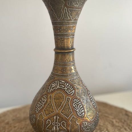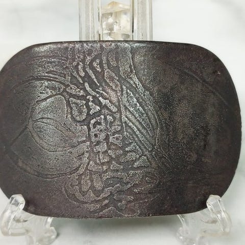 Islamisk Mellemøsten Beskyttende Magisk Messing-Talisman, fra 1900-tallet, i god stand; begge sider er udsmykket med talismaniske indskrifter og den er 8 cm lang. Klik på den blå "gå til varen" knap, for at købe eller byde på denne vare. Den samlede pris vil blive vist inden du afgiver dit bud.