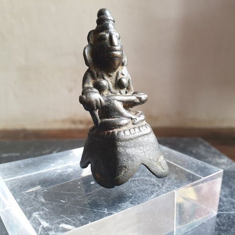 Bronce patineret skulptur fra Indien, med titel Cavallo con Mahut "giocattolo da Tempio", dateret til fin de siècle (slutningen af det 19. århundrede – begyndelsen af det 20. århundrede), 18 cm høj, 10 cm bred, 14,5 cm dyb, vægt 1670 g, tilskrevet Original, i god stand med tempel-værd context. Klik på den blå "gå til varen" knap, for at købe eller byde på denne vare. Den samlede pris vil blive vist inden du afgiver dit bud.