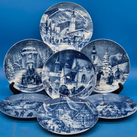 Til salg er et kvalitetsæt bestående af syv dekorative væg tallerkener fra serien "Juleaftener i tyske byer", fremstillet af Berlin Design i traditionel blå-porcelæns-teknik.