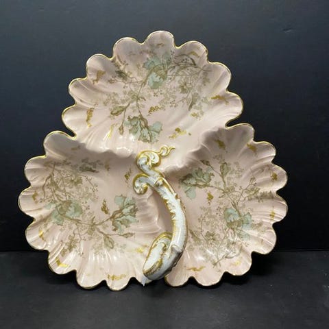 Indretningen præsenterer en delikat blomsterkrans, med detaljer forgyldt i guld, der indkapsler elegancen i begyndelsen af det tyvende århundrede.