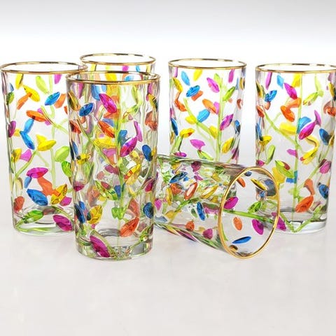 Disse fantastiske glas er udskåret med blomstermotiver af grene og småblade. Hver udskæring er håndmalet med lyse farver.