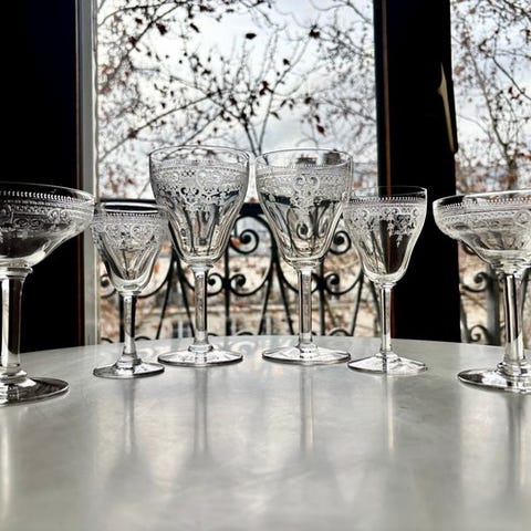 Dekantøren er smukt dekoreret med indgraverede blomsterornamenter og forgrenede løvgrene, hvilket giver den en let og yndefuld karakter. Sådanne små dekantører blev produceret i forskellige nuancer, herunder klar, grøn, gul og lilla krystal, og blev højt værdsat for deres dekorative og funktionelle appel.