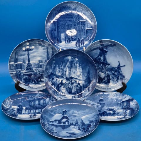 Til salg er et dekorativt sæt bestående af syv vægplader fra serien „Juleaften i Goslar“, fremstillet af Berlin Design i klassisk Blue-China-teknik.
