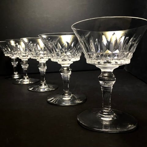 Elegant sæt af coupe-glas signeret Baccarat, der består af 6 facetterede krystalglas, et tidløst kunstværk fra det berømte franske hus.