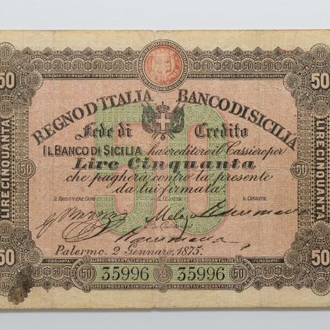 Italiensk banknote fra 22/07/1885 fra Banca Nazionale - Gigante BNR, 100 stk, ikke graderet; se billederne for et korrekt indtryk. Klik på den blå "gå til varen" knap, for at købe eller byde på denne vare. Den samlede pris vil blive vist inden du afgiver dit bud.
