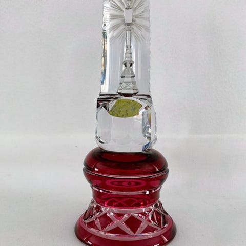 En moderne UGLE-SKULPTUR designet af Yan Zoritchak og lavet af Val Saint Lambert i Belgien. Skulpturen er formet som et lodret trekantet prisme. Et enkelt cirkulært hul (konkav) er fræset ind i bagsiden. På grund af lysbrydningen gennem sidefacetterne fremstår dette enkelt hul som TO ØJNE, når det ses forfra, hvilket skaber en fascinerende optisk illusion. Toppen eller fronten af uglen er delvist frostet for at antyde fjer eller et ansigt, mens resten af krystallen forbliver klar og poleret.