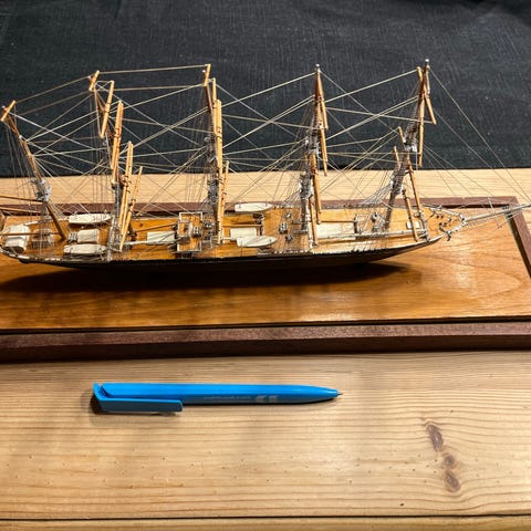 Elegant træramme, der forestiller halvskroget 'Blue Nose' på en baggrund af et søkort i en glasfrontet trææske.