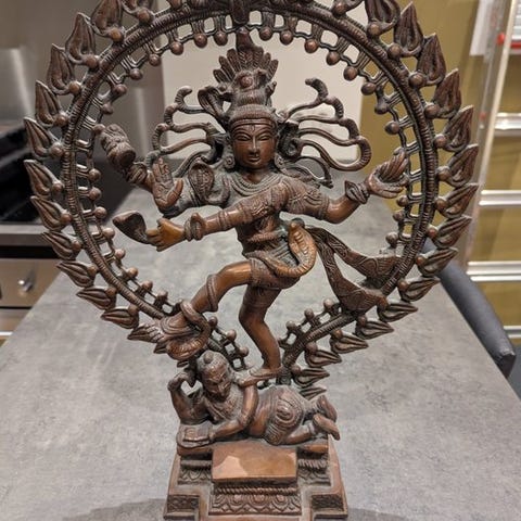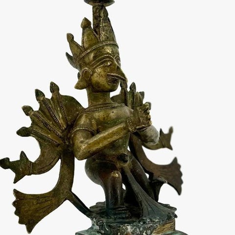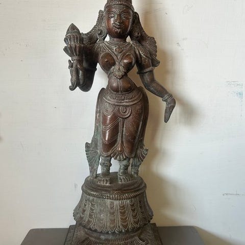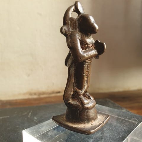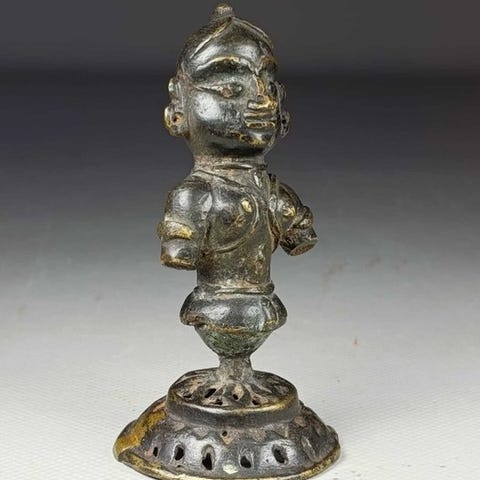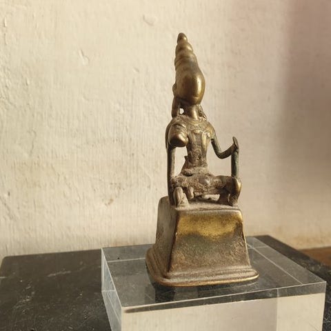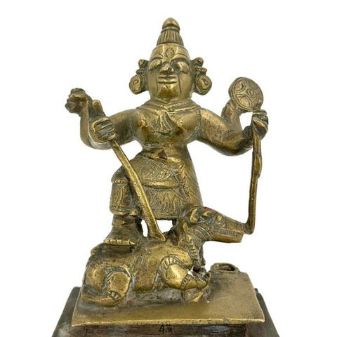 Bronzeskulptur med titlen Durga mahishamardini fra Indien, fra det 16. århundrede, gylden patina og sorte rester af snavs, mål: højde 8 cm, bredde 4,5 cm, dybde 3,5 cm. Klik på den blå "gå til varen" knap, for at købe eller byde på denne vare. Den samlede pris vil blive vist inden du afgiver dit bud.