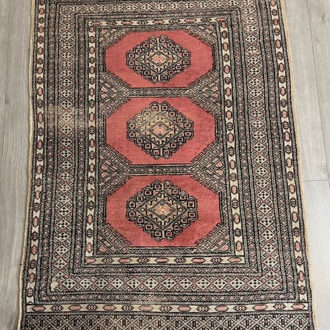 Håndvævet Buchara-tæppe fra Pakistan, 161 × 63 cm, uldtæt på bomuld, fremstillet i slutningen af det 20. århundrede, i god stand med tegn på alder og brug. Klik på den blå "gå til varen" knap, for at købe eller byde på denne vare. Den samlede pris vil blive vist inden du afgiver dit bud.