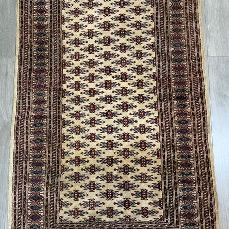 De smalle, gentagne lagdelte kantbånd viser fint udarbejdede geometriske ornamenter i mørkeblå, sorte og creme accenter og indrammer det centrale mønster tydeligt. Typisk for Bukhara-tæpper er den ensartede mønsterføring og den tidløse, elegante fremtræden – ideel som løber eller smalt akcentteppe.
