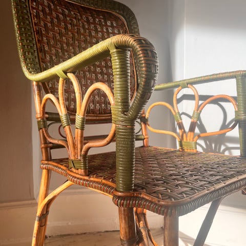 Vintage hjørnestol fra Frankrig fra 1960–1970 med massiv trækarm og håndvævet fletningssæde, brun, mål 70 × 43 × 43 cm, siddehøjde 40 cm, i god stand med mindre tegn på ælde. Klik på den blå "gå til varen" knap, for at købe eller byde på denne vare. Den samlede pris vil blive vist inden du afgiver dit bud.