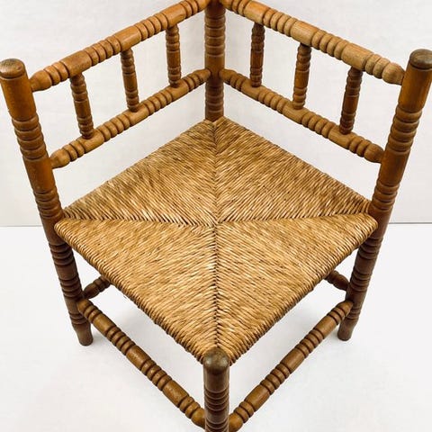 Dette charmerende vintage hjørnestol har en solid træramme, en varm, mørk patina og et smukt håndvævet sivsæde. Designet til at passe pænt ind i ethvert hjørne, er den både dekorativ og funktionel, perfekt til entréer, soveværelser eller rustikke indretninger.