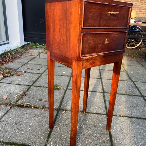 Toonbank i vintage industrielt design fra Scandinavisk design, 1950–1960, i brunt træ og glas, 95 cm høj, 55 cm dyb, 3600 cm bred, med tre skuffer og seks hjul, i dårlig til meget brugt stand med store skader eller manglende dele. Klik på den blå "gå til varen" knap, for at købe eller byde på denne vare. Den samlede pris vil blive vist inden du afgiver dit bud.