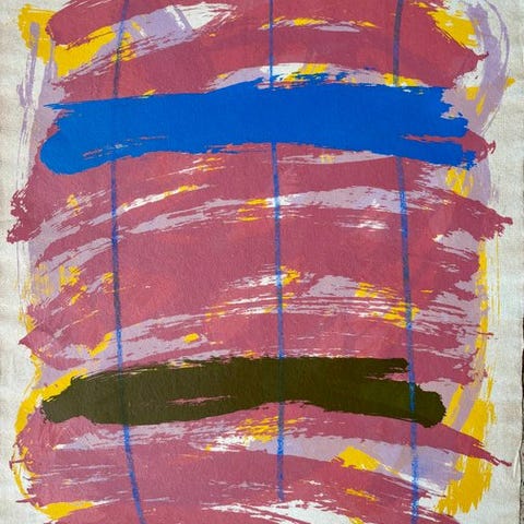 Serigrafi på papir. Dette værk forestiller et landskab, der kombinerer elementer fra naturen og den arkitektoniske tilstedeværelse, med en bro som det centrale omdrejningspunkt i kompositionen.