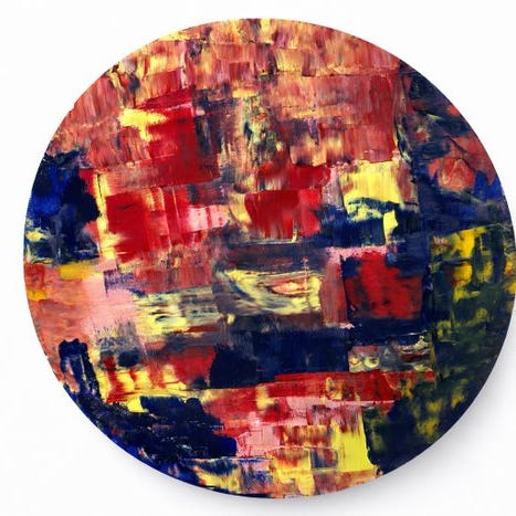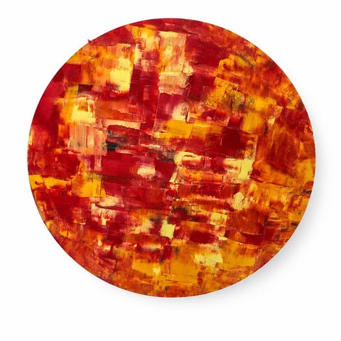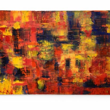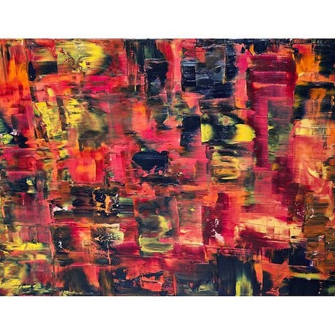 Kompositionen domineres af en intens og dyb palet: klare gule, varme røde, grønne og mørkeblå træder frem og overlapper hinanden og skaber visuel spænding og pauser, som fragmenter af lys, der rejser sig frem af en tæt og gennemlevet masse. Hver del af maleriet taler med hinanden og opretholder en dynamisk