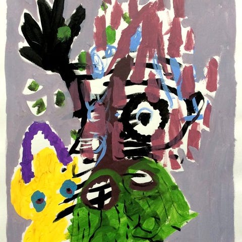 Dette maleri på maroufleret papir præsenterer et fragmenteret ansigt, bygget af brede farvefelter og en fri gestus, næsten instinktiv. Portrettet er ikke beskrivende i klassisk
