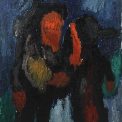 Dette er et eksklusivt værk fra en tidlig periode af Jan Sierhuis (1928-2023), hvori to sammenflettede figurer er gengivet ekspressivt.