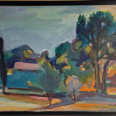 Yves Alix (1890-1969), Plaine de Pampelone, 1948, olie på lærred, originaludgave, signeret, indrammet, ca. 54 × 40 cm, abstrakt landskab, i fremragende stand. Klik på den blå "gå til varen" knap, for at købe eller byde på denne vare. Den samlede pris vil blive vist inden du afgiver dit bud.