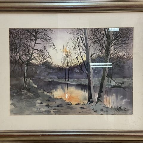 Et værk udført i akryl på táblex. Kunstneren viser os et landbrugslandskab, han gør brug af løse penselstrøg og en farvepalet bestående af grønne, blå og okker.