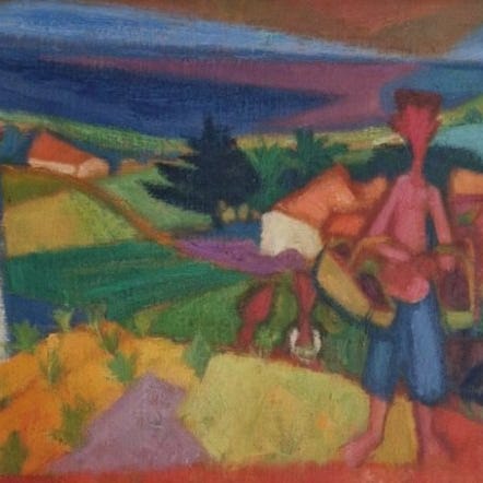Originalt maleri af maleren André Roubaud, der forestiller et provencalsk landskab med lavendelmarker og en mas.