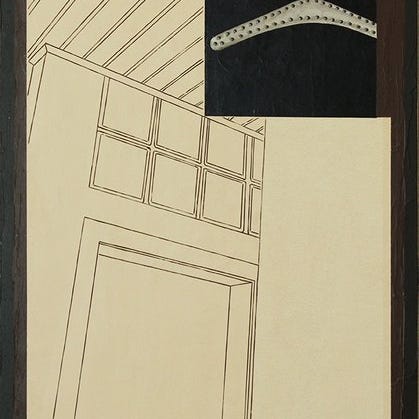 Dette maleri på papir præsenterer en tæt og dynamisk komposition, struktureret omkring overlappende former og kontrastfyldte farver. På en lys grå baggrund skærer grønne, gule, bordeauxrøde, blå og sorte flader hinanden, hvilket frembringer hybride figurer med bevidst ustabile