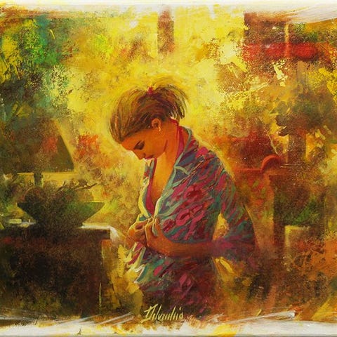 Par oliemalerier på lærred af Adolfo Mastrovito (1940–2000), Lungo il fiume og La raccolta delle mele, måler henholdsvis 18 × 24 cm og 24 × 18 cm, håndsigneret, originaludgave, fra 1990–2000, produceret i Italien og solgt af Galleria, med certifikater for autenticidade og provenance. Klik på den blå "gå til varen" knap, for at købe eller byde på denne vare. Den samlede pris vil blive vist inden du afgiver dit bud.