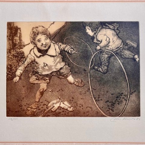 Værk i blandet teknik, ætsning og aquatint. Det forestiller spillet hoppeleg.
