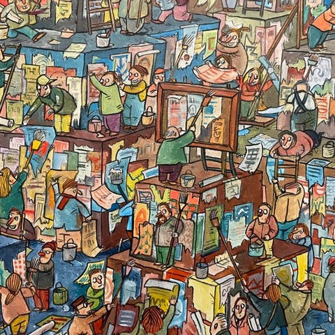 Blandet medier på panel, papirhåndværk og tape