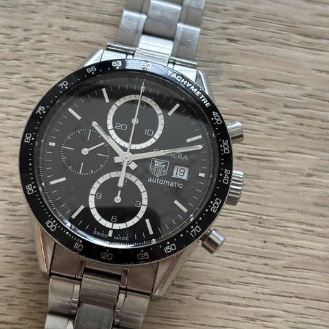 Tag Heuer Carrera Calibre 16 automatisk herreur, reference CV2011, 41 mm stål gevald, sølvfarvet urskive, safirglas, stålrem ca. 160 mm i total længde, folding clasp, vandtæthed 5 ATM, ca. 2010, meget god stand med mindre brugsspor. Klik på den blå "gå til varen" knap, for at købe eller byde på denne vare. Den samlede pris vil blive vist inden du afgiver dit bud.