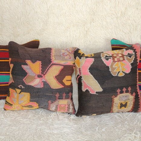 Set på fire 45x45 cm uldpuder fra Türkiye, middelalderlig vintag kilim-stykker håndlavet til Rustic Vintage, bagside af holdbart bomuld med skjult lynlås, ikke inkluderede pudeindlæg, i god stand med små aldersmærker. Klik på den blå "gå til varen" knap, for at købe eller byde på denne vare. Den samlede pris vil blive vist inden du afgiver dit bud.